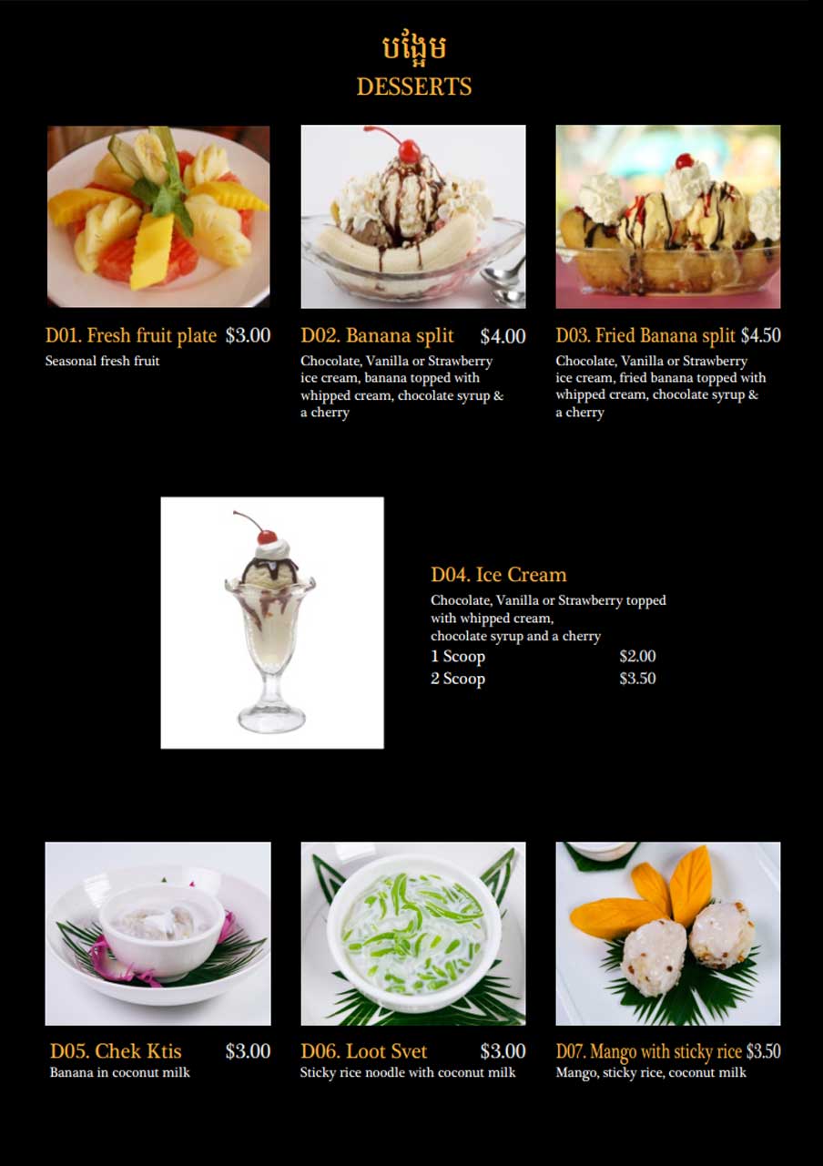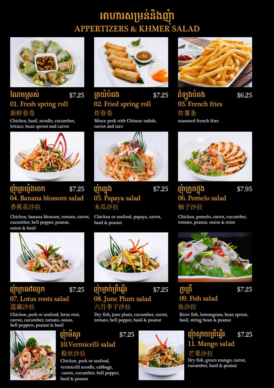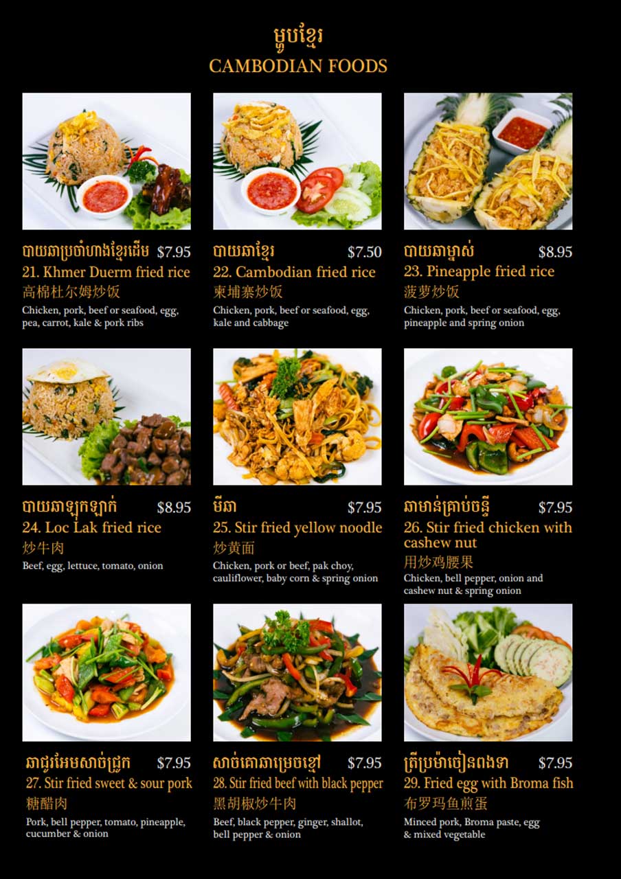 At Khmer Duerm, we invite you to experience the rich and diverse flavors of traditional Cambodian cuisine, prepared with the freshest ingredients and culinary techniques passed down through generations. Our menu offers a variety of dishes that cater to all tastes, from flavorful main courses to delightful appetizers, refreshing beverages, and indulgent desserts.